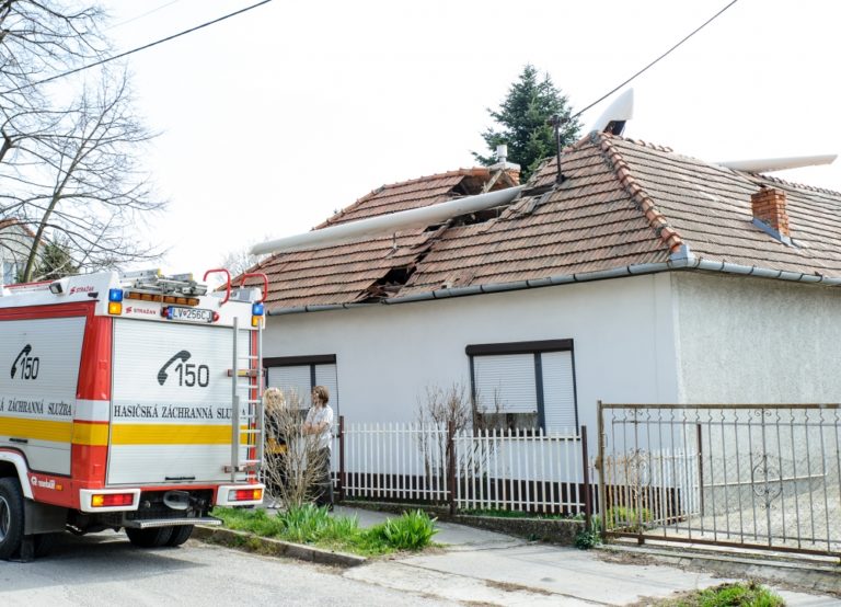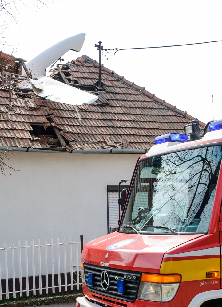 Bezmotorové lietadlo padnuté na strechu rodinného domu na Zobore v Nitre. Pilot sa stihol katapultovať ešte pred dopadom vetroňa. Nitra, 2. apríl 2016. Foto: SITA/Martin Havran