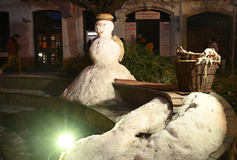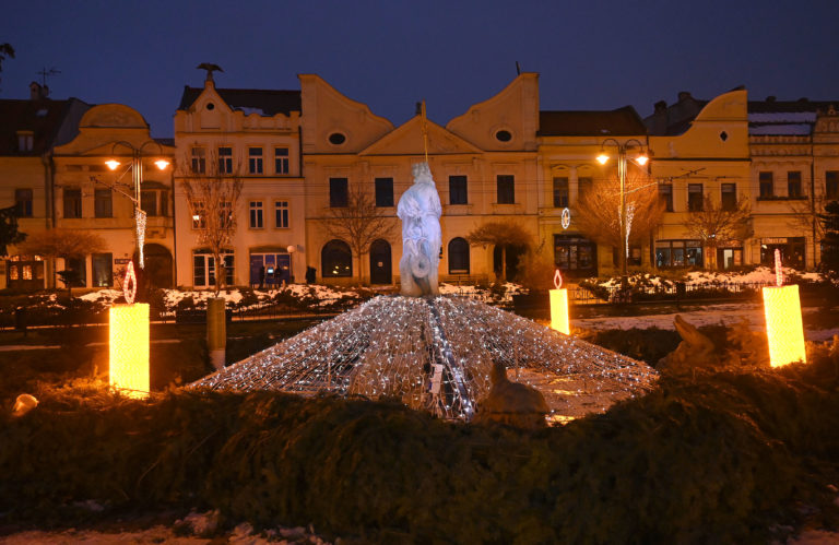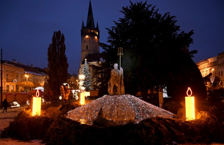 Neptúnová fontána počas tretej adventnej nedele v meste Prešov. Prešov 17. december 2023. Foto: SITA/Viktor Zamborský