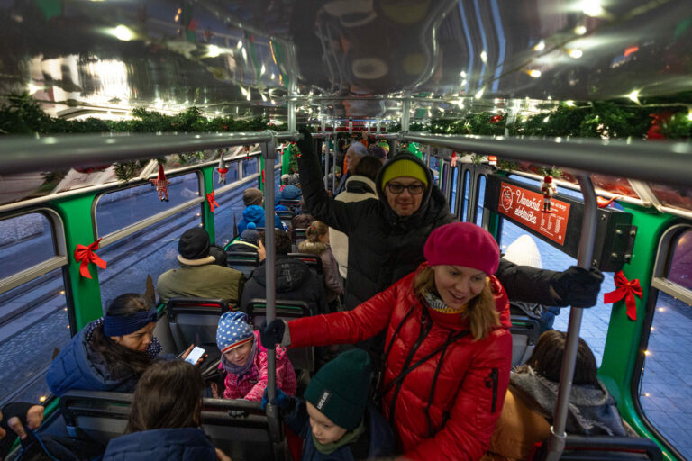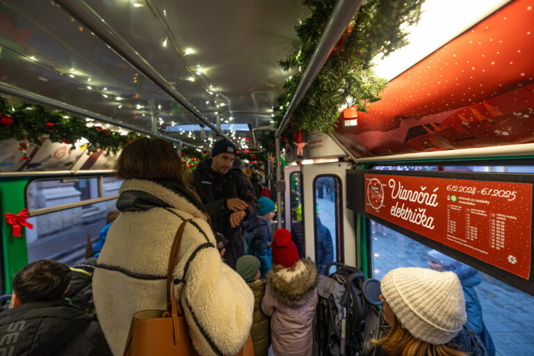 Návštevníci vo vianočnej električke v uliciach hlavného mesta. Bratislava, 7. december 2024. Foto: SITA/Jana Birošová