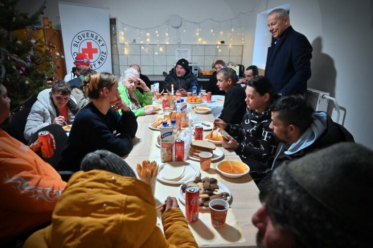 Účastnici vianočnej kapustnice pre ľudí bez domova pod názvom Dračí dych v Nocľahárni Večierka. Banská Bystrica, 24. december 2024. Foto: SITA/Jakub Julény.