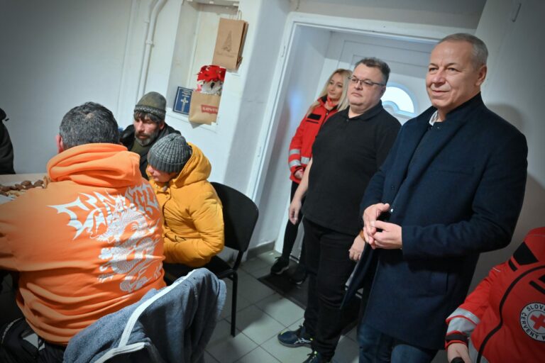 Primátor mesta Banská Bystrica Ján Nosko (vpravo) počas vianočnej kapustnice pre ľudí bez domova pod názvom Dračí dych v Nocľahárni Večierka. Banská Bystrica, 24. december 2024. Foto: SITA/Jakub Julény.