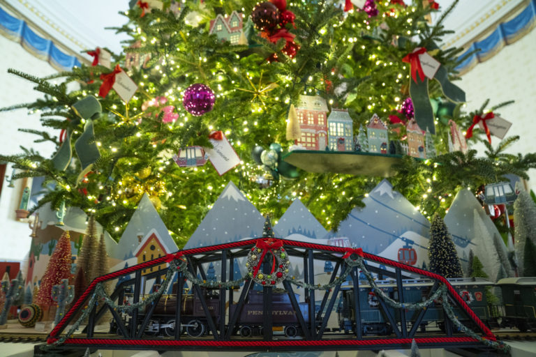 Modrú izbu Bieleho domu zdobí vianočný vláčik. Foto: SITA/AP
