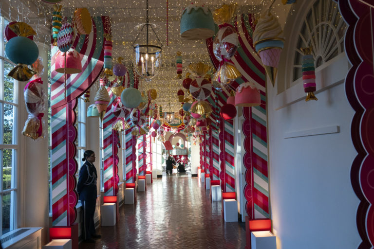 Jedna z chodieb vyzdobená s rôznymi vianočnými ozdobami, ktoré pripomínajú sladkosti. Foto: SITA/AP