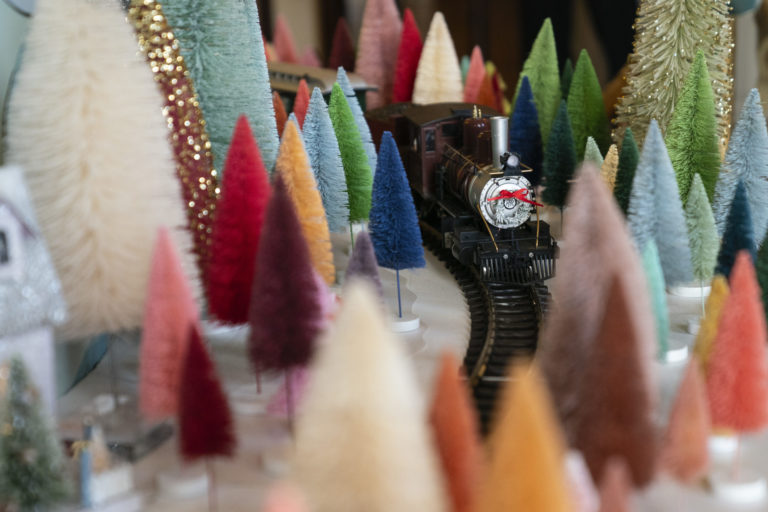 Malé farebné stromčeky, ktoré sa nachádzajú v Modrej izbe a lemujú koľajnice malého vianočného vláčika. Foto: SITA/AP