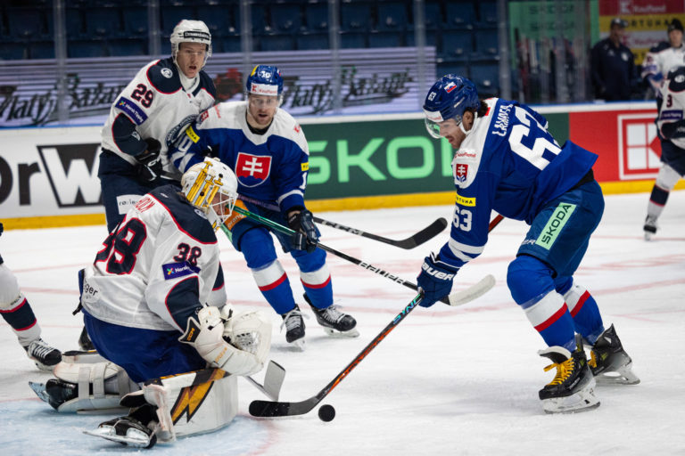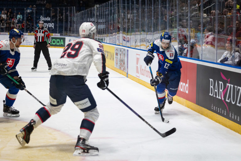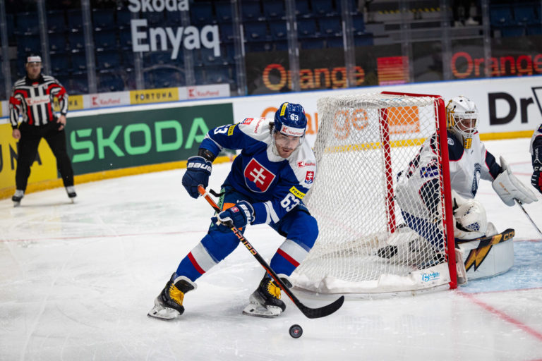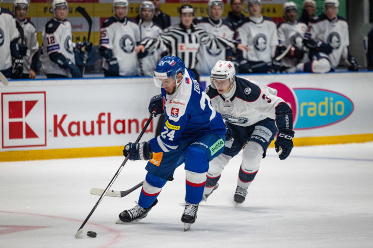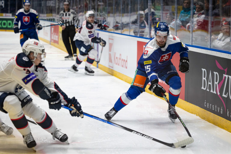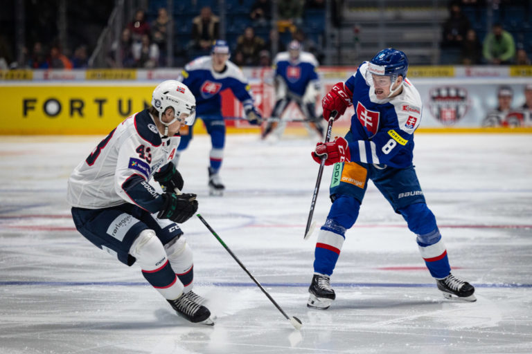 Marko Stacha zo Slovenska (vpravo) počas hokejového zápasu Vianočného Kaufland Cup medzi Slovensko - Nórsko. Bratislava, 13. december 2023. Foto: SITA/Jana Birošová
