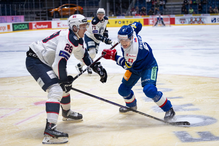 Sprava v popredí: Oliver Okuliar zo Slovenska a Kristian Sjodahl Ostby z Nórska počas hokejového zápasu Vianočného Kaufland Cup medzi Slovensko - Nórsko. Bratislava, 13. december 2023. Foto: SITA/Jana Birošová