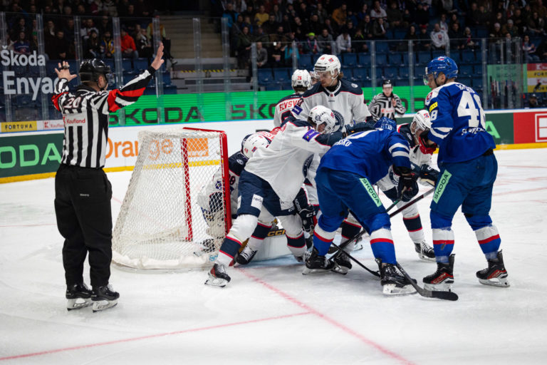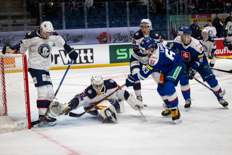 Herná situácia pred bránou počas hokejového zápasu Vianočného Kaufland Cup medzi Slovensko - Nórsko. Bratislava, 13. december 2023. Foto: SITA/Jana Birošová