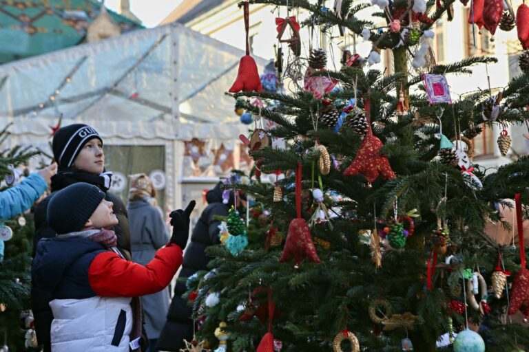 Deti si prezerajú ozdoby v rámci súťažnej prehliadky vianočných stromčekov na Priamciálnom námestí. Bratislava. 1. december 2024. Foto: SITA/Tomáš Susko.
