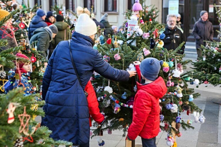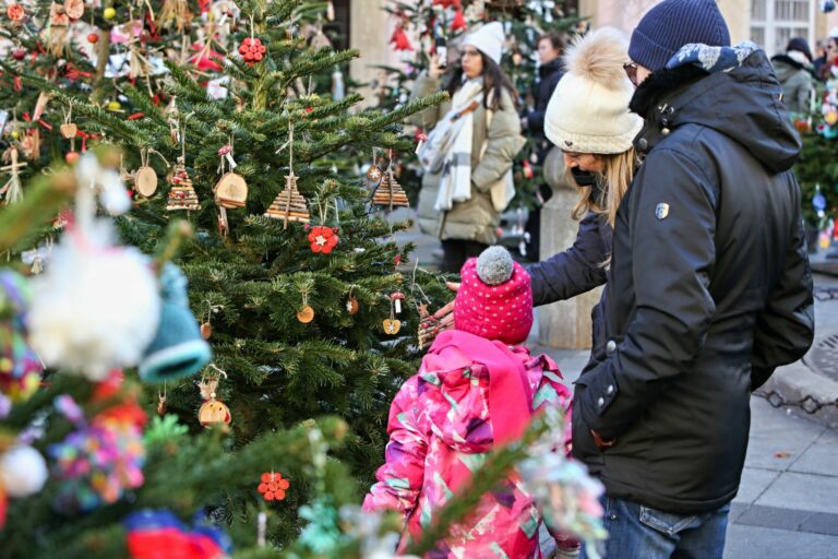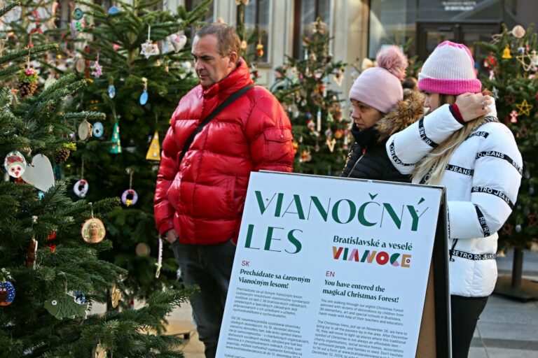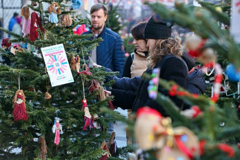 Ľudia si prezerajú ozdoby v rámci súťažnej prehliadky vianočných stromčekov na Priamciálnom námestí. Bratislava. 1. december 2024. Foto: SITA/Tomáš Susko.