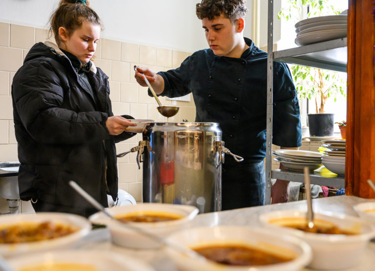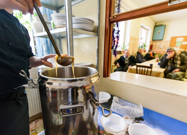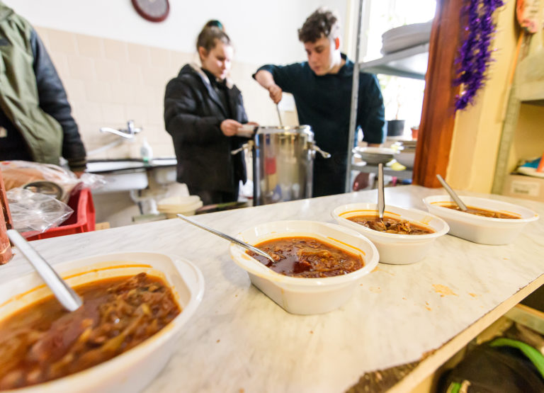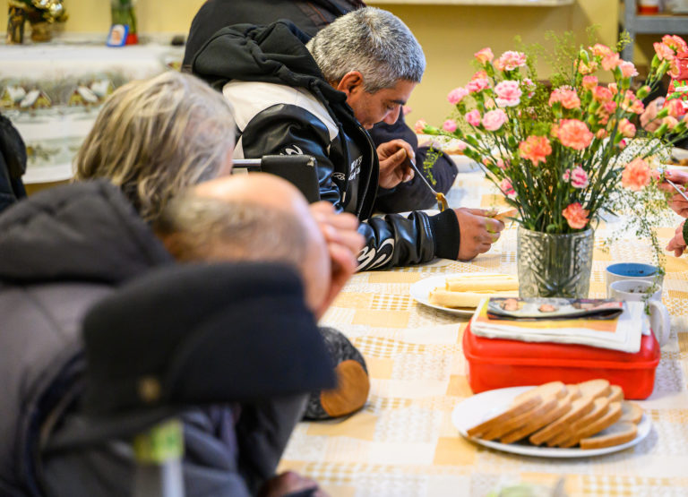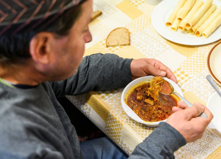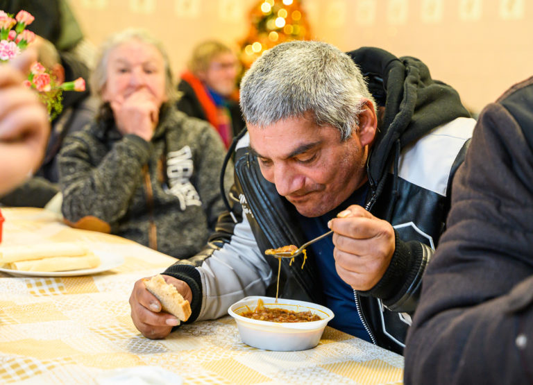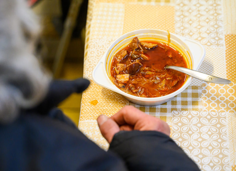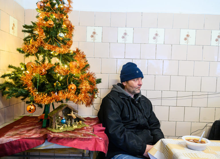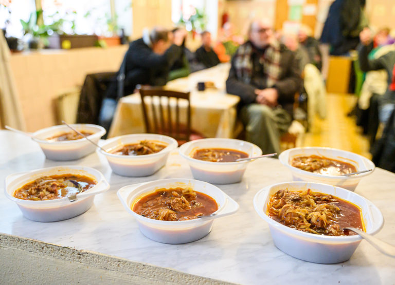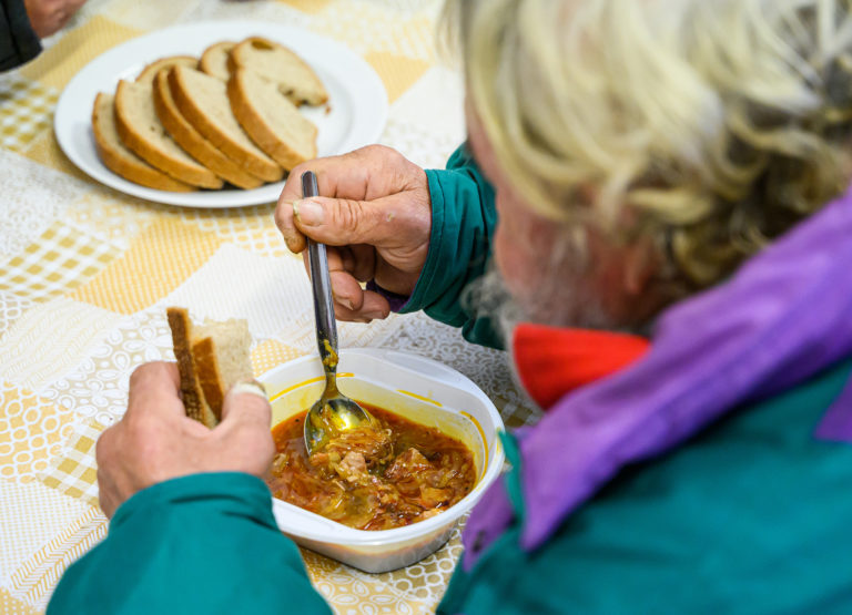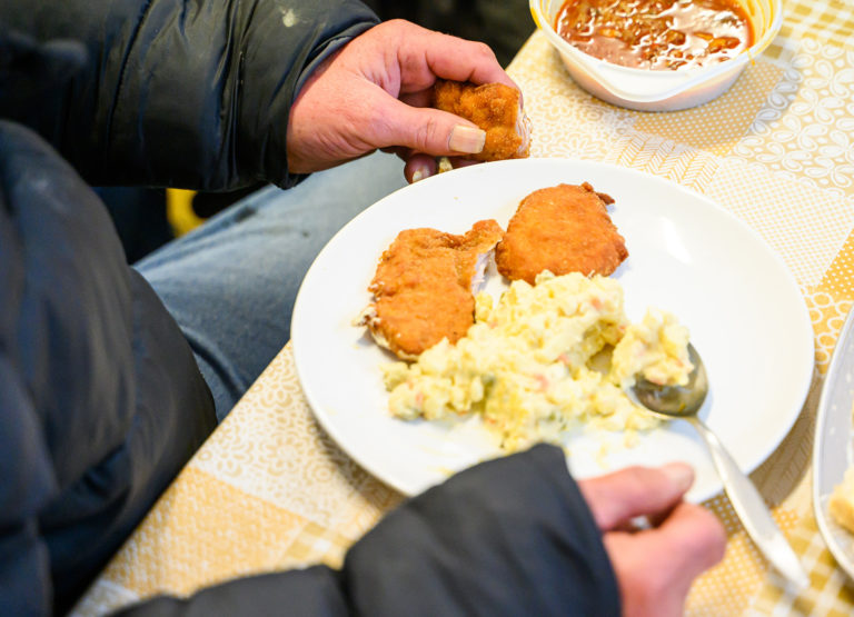 Vianočný obed v podobe teplej kapustnice a zemiakového šalátu s rezňom pre ludí bez domova v Nitre. Nitra, 24. december 2023. Foto: SITA/Martin Havran