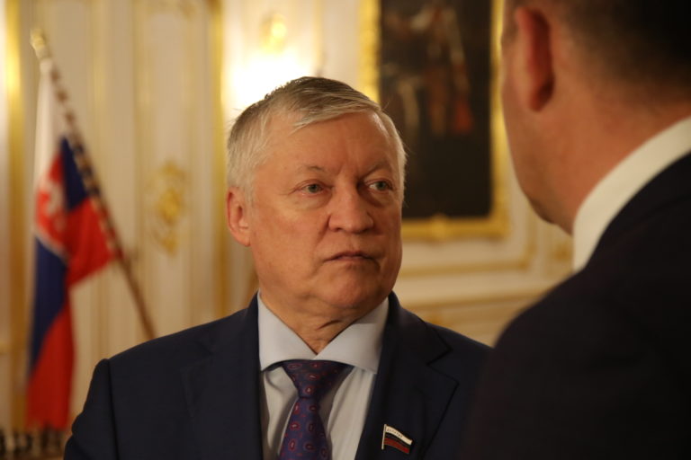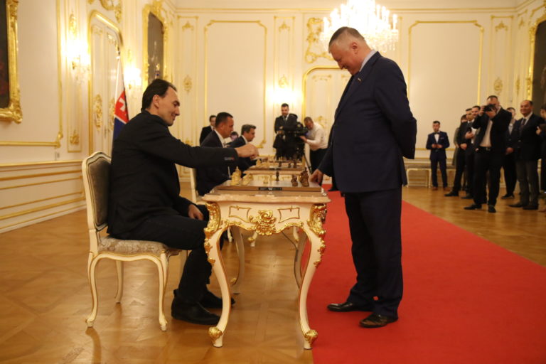 Zľava: Šachový virtuóz Anatolij Karpov a predseda parlamentu Andrej Danko počas šachovej exhibície v reprezentačných priestoroch na Bratislavskom hrade pri príležitosti 3. ročníka vianočného šachového turnaja predsedu Národnej rady SR. Bratislava, 9. december 2019. Foto: SITA/Alexandra Čunderlíková