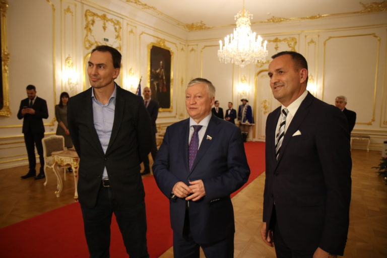 Zľava: Manažér slovenskej hokejovej reprezentácie Miroslav Šatan, šachový virtuóz Anatolij Karpov a poslanec parlamentu za stranu SNS a bývalý futbalista Dušan Tittel počas šachovej exhibície v reprezentačných priestoroch na Bratislavskom hrade pri príležitosti 3. ročníka vianočného šachového turnaja predsedu Národnej rady SR. Bratislava, 9. december 2019. Foto: SITA/Alexandra Čunderlíková