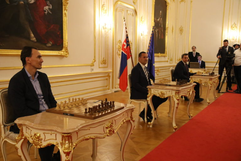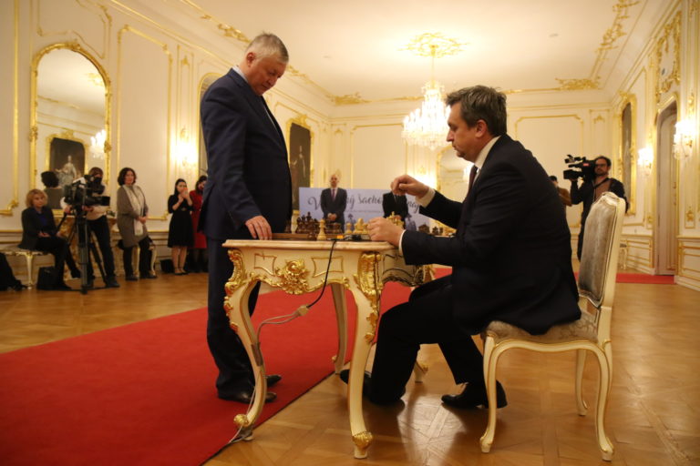 Šachový virtuóz Anatolij Karpov (vľavo) počas šachovej exhibície v reprezentačných priestoroch na Bratislavskom hrade pri príležitosti 3. ročníka vianočného šachového turnaja predsedu Národnej rady SR. Bratislava, 9. december 2019. Foto: SITA/Alexandra Čunderlíková