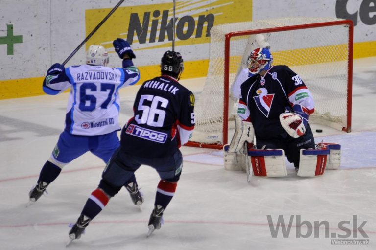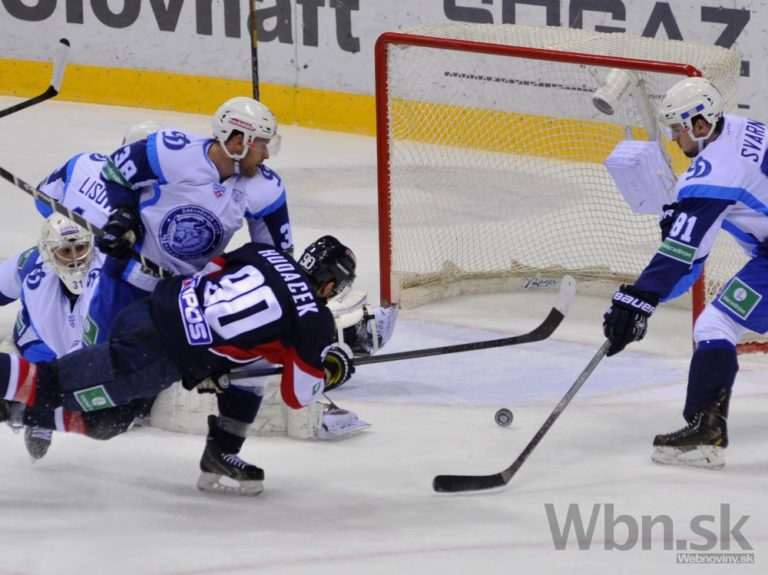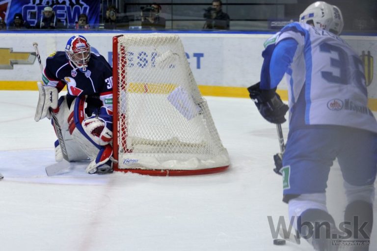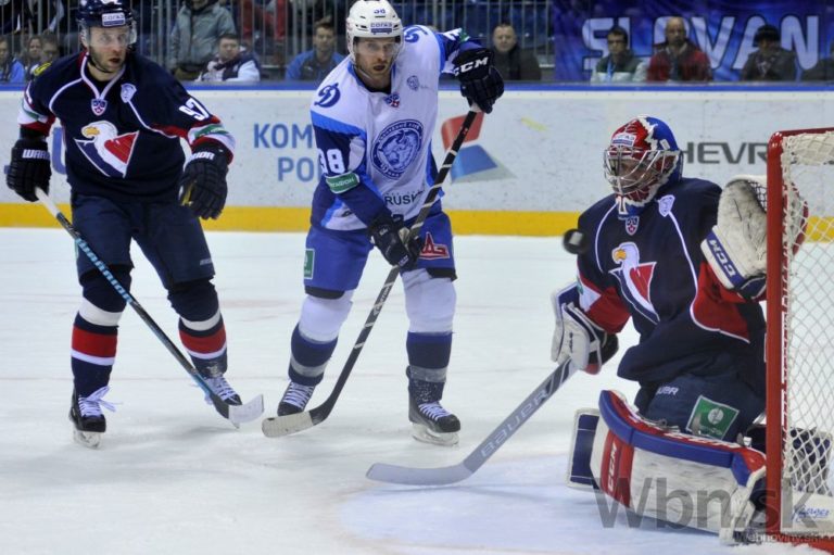 Útočník Dinama Minsk Paul Szczechura a obranca Slovana Bratislava Tomáš Starosta sledujú zákrok brankára Denisa Godlu počas zápasu Kontinentálnej hokejovej ligy (KHL). Bratislava, 20. január 2015. Foto: SITA/Ján Slovák