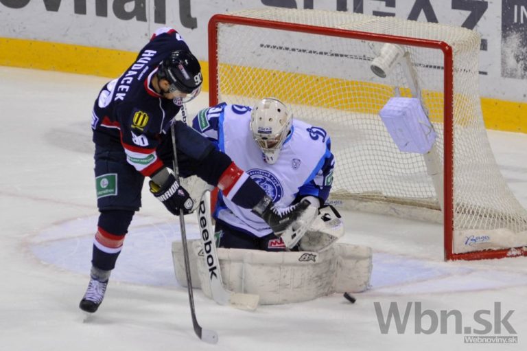 Útočník Slovana Bratislava Libor Hudáček sa snaží prekonať brankára Dinama Minsk Dannyho Taylora počas zápasu Kontinentálnej hokejovej ligy (KHL). Bratislava, 20. január 2015. Foto: SITA/Ján Slovák