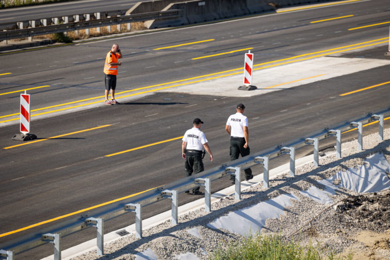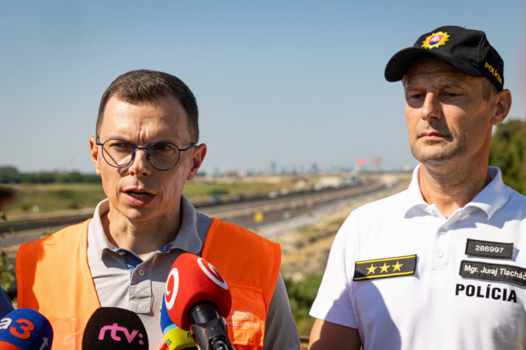Zľava: Generálny riaditeľ NDS Filip Macháček a riaditeľ odboru dopravnej polície Prezídia PZ Juraj Tlacháč počas brífingu v rámci víkendových stavebných prác na diaľnici D1. Bratislava, 27. júl 2024. Foto: SITA/Jana Birošová.