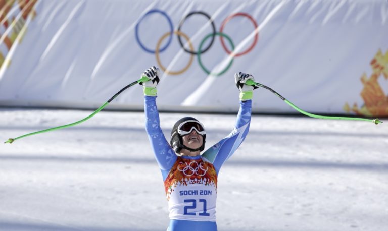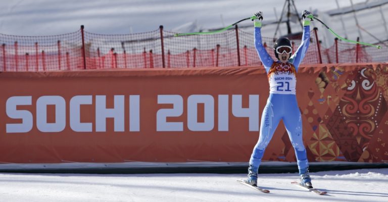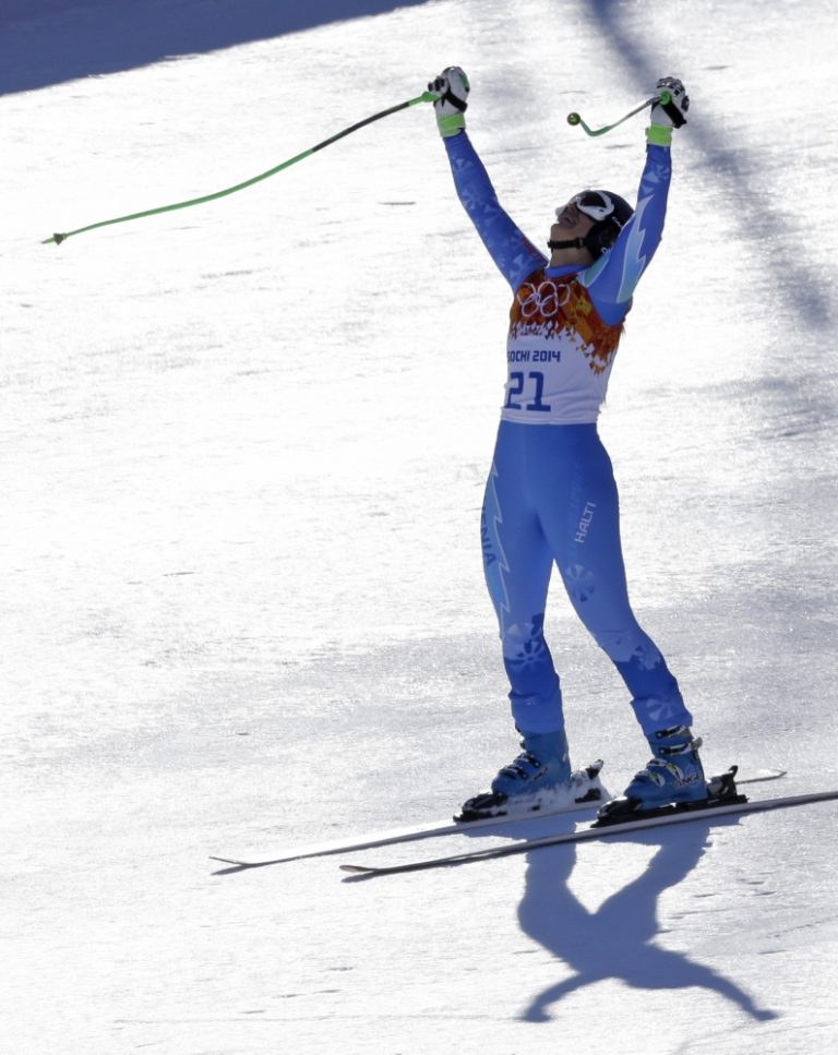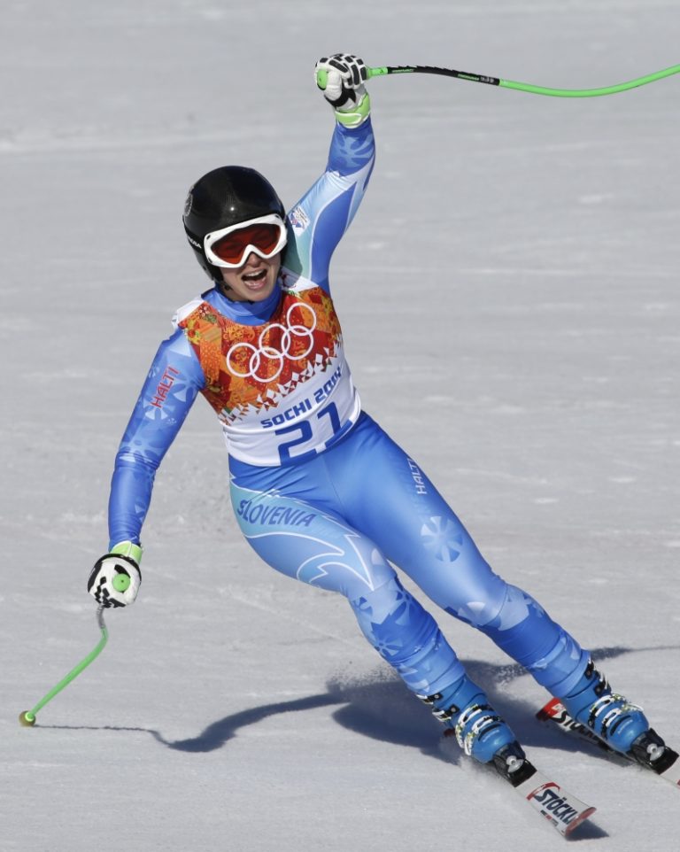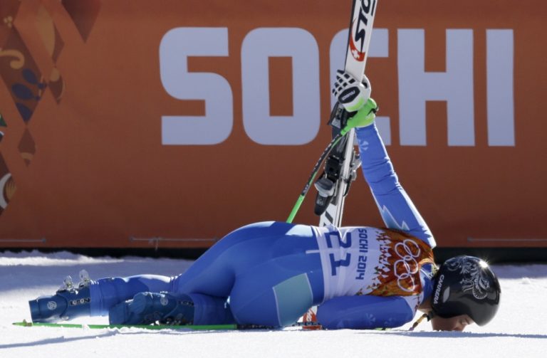 Slovinská lyžiarka Tina Mazeová bozkáva sneh v cieli stredajšieho zjazdu žien, v ktorom spoločne so Švajčiarkou Dominikou Gisinovou dosiahli rovnaký čas a získali zlaté medaily. Foto: SITA/AP