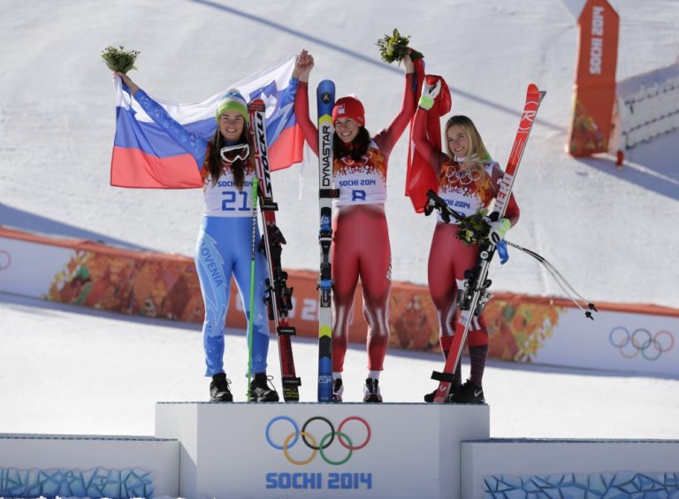 Zľava: Zlaté medailistky Tina Mazeová a Dominique Gisinová a bronzová Lara Gutová na stupňoch pre víťazky po stredajšom zjazde žien. Foto: SITA/AP