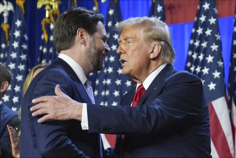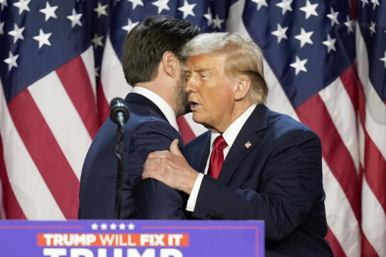 Republikánsky kandidát na viceprezidenta, senátor JD Vance, R-Ohio, vľavo, objíma republikánskeho kandidáta na prezidenta Donalda Trumpa. Foto: SITA/AP