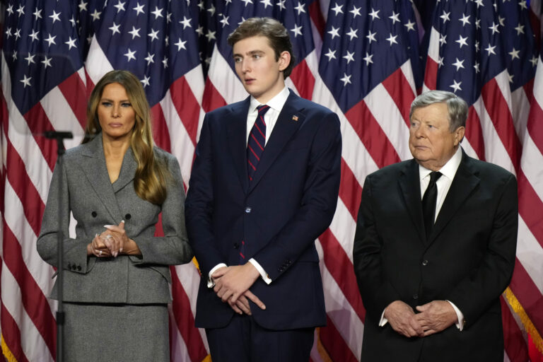 Melania Trumpová, zľava jej syn Barron Trump a otec Viktor Knavs sa pozerajú na republikánskeho kandidáta na prezidenta Donalda Trumpa. Foto: SITA/AP