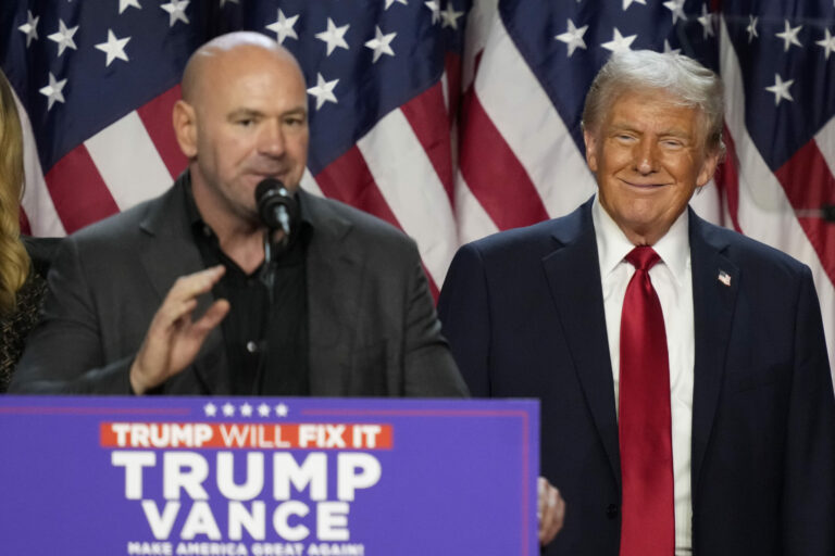 Republikánsky kandidát na prezidenta, Donald Trump, sa pozerá na výkonného riaditeľa UFC Danu Whitea. Foto: SITA/AP