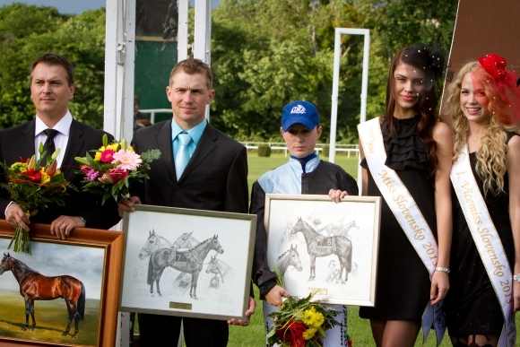 Víťaz dostihu Veľká cena Slovenska kôň Donn Halling a dž. Vendula Korečková na 35. ročníku Turf-gala Allianz - Slovenskej poisťovne. Bratislava, 2. jún 2013. Foto: SITA/Ľudovít Vaniher