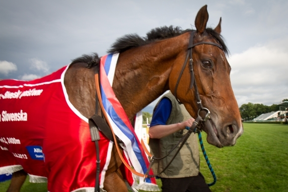 Víťaz dostihu Veľká cena Slovenska kôň Donn Halling na 35. ročníku Turf-gala Allianz - Slovenskej poisťovne. Bratislava, 2. jún 2013. Foto: SITA/Ľudovít Vaniher