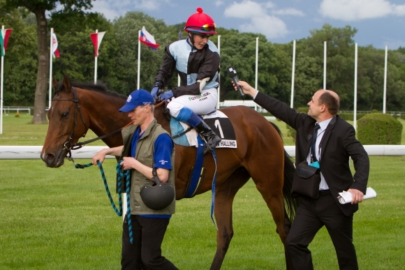 Víťaz dostihu Veľká cena Slovenska dž. Vendula Korečková na 35. ročníku Turf-gala Allianz - Slovenskej poisťovne. Bratislava, 2. jún 2013. Foto: SITA/Ľudovít Vaniher