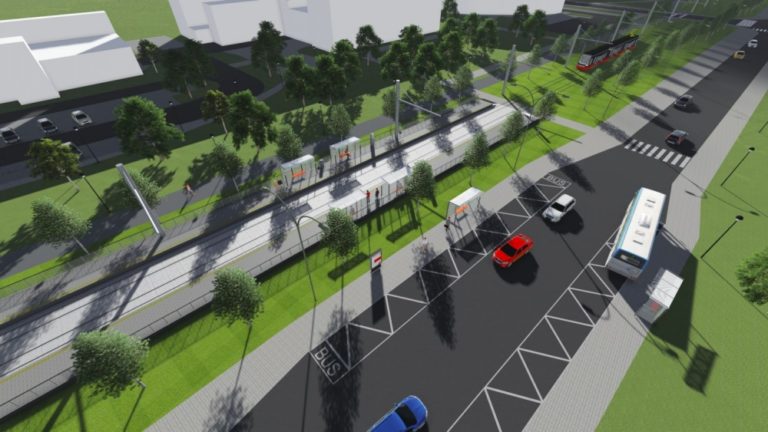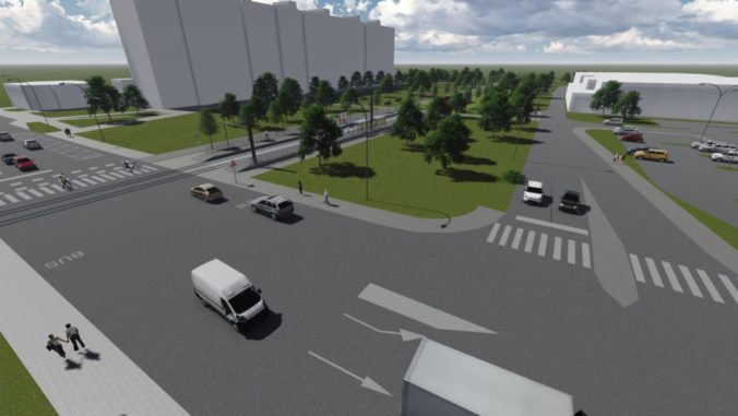 Vizualizácia druhej časti električkovej trate do Petržalky, ktorá pôjde od Bosákovej po Janíkov dvor. Na snímke: Zástavka Zrkadlový háj - južný pohľad od ulice Romanova, vpravo parkovisko OC Kaufland. Zámer je v súčasnosti v procese posudzovania vplyvov na životné prostredie (EIA) a verejnosť sa môže k nemu písomne vyjadriť do 14. marca. Návrh električkovej trate je súčasťou nosného systému MHD, prevádzkový úsek Janíkov dvor – Šafárikovo námestie. Bratislava, 9. marec 2016. Foto: SITA/Spoločnosť Reming Consult