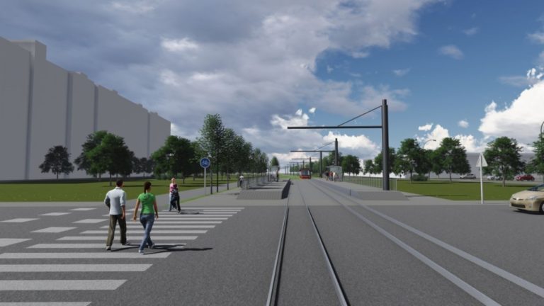 Vizualizácia druhej časti električkovej trate do Petržalky, ktorá pôjde od Bosákovej po Janíkov dvor. Na snímke: Zástavka Zrkadlový háj - južný pohľad v osi koľaje od ulice Romanova na zástavku TRAM. Zámer je v súčasnosti v procese posudzovania vplyvov na životné prostredie (EIA) a verejnosť sa môže k nemu písomne vyjadriť do 14. marca. Návrh električkovej trate je súčasťou nosného systému MHD, prevádzkový úsek Janíkov dvor – Šafárikovo námestie. Bratislava, 9. marec 2016. Foto: SITA/Spoločnosť Reming Consult