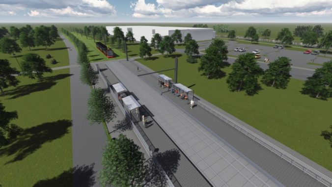 Vizualizácia druhej časti električkovej trate do Petržalky, ktorá pôjde od Bosákovej po Janíkov dvor. Na snímke: Zástavka Veľký Dražiadiak - juhozápadný pohľad od Jantárovej cesty v smere na Športovú halu. Zámer je v súčasnosti v procese posudzovania vplyvov na životné prostredie (EIA) a verejnosť sa môže k nemu písomne vyjadriť do 14. marca. Návrh električkovej trate je súčasťou nosného systému MHD, prevádzkový úsek Janíkov dvor – Šafárikovo námestie. Bratislava, 9. marec 2016. Foto: SITA/Spoločnosť Reming Consult