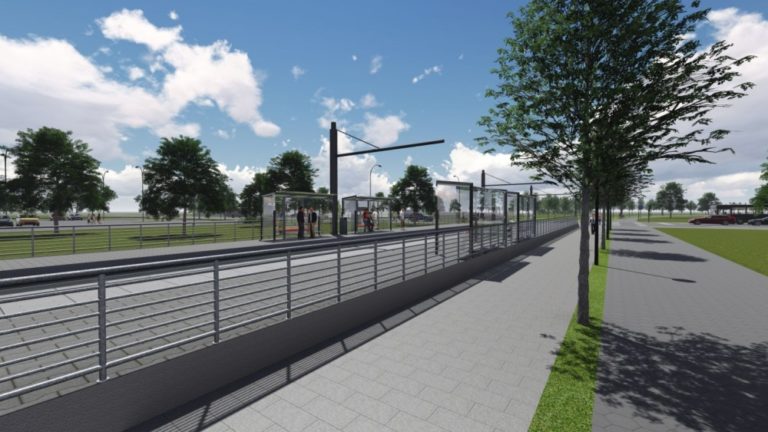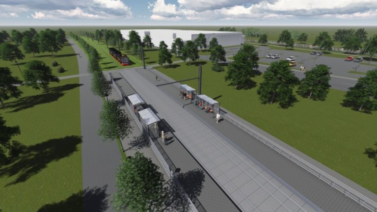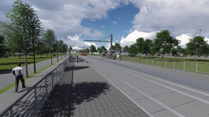 Vizualizácia druhej časti električkovej trate do Petržalky, ktorá pôjde od Bosákovej po Janíkov dvor. Na snímke: Zástavka Veľký Dražiadiak - pohľad z nástupišťa smer juh. Zámer je v súčasnosti v procese posudzovania vplyvov na životné prostredie (EIA) a verejnosť sa môže k nemu písomne vyjadriť do 14. marca. Návrh električkovej trate je súčasťou nosného systému MHD, prevádzkový úsek Janíkov dvor – Šafárikovo námestie. Bratislava, 9. marec 2016. Foto: SITA/Spoločnosť Reming Consult