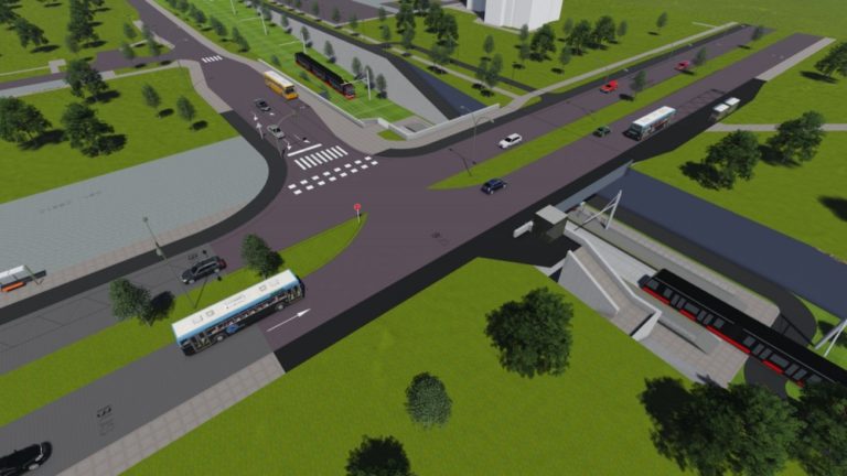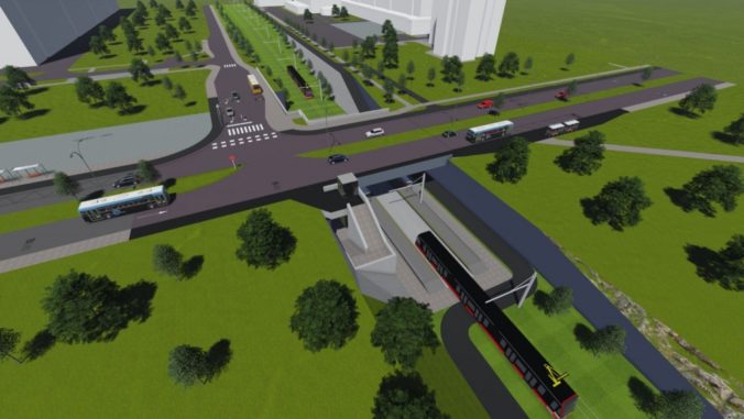 Vizualizácia druhej časti električkovej trate do Petržalky, ktorá pôjde od Bosákovej po Janíkov dvor. Na snímke: Zástavka Stred - celkový pohľad južným smerom na križovatku Jantárová - Kutlíkova - Pajštúnska so zástavkou TRAM v podjazde. Zámer je v súčasnosti v procese posudzovania vplyvov na životné prostredie (EIA) a verejnosť sa môže k nemu písomne vyjadriť do 14. marca. Návrh električkovej trate je súčasťou nosného systému MHD, prevádzkový úsek Janíkov dvor – Šafárikovo námestie. Bratislava, 9. marec 2016. Foto: SITA/Spoločnosť Reming Consult