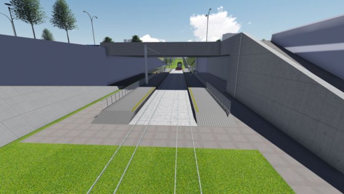 Vizualizácia druhej časti električkovej trate do Petržalky, ktorá pôjde od Bosákovej po Janíkov dvor. Na snímke: Zástavka Stred - pohľad severným smerom na zárezm zástavku a most na Pajštúnskej ulici, vpravo Jantárová cesta. Zámer je v súčasnosti v procese posudzovania vplyvov na životné prostredie (EIA) a verejnosť sa môže k nemu písomne vyjadriť do 14. marca. Návrh električkovej trate je súčasťou nosného systému MHD, prevádzkový úsek Janíkov dvor – Šafárikovo námestie. Bratislava, 9. marec 2016. Foto: SITA/Spoločnosť Reming Consult