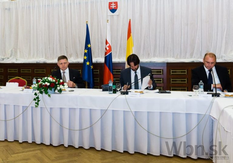 Predseda vlády SR Robert Fico (vľavo) a predseda ŽSK Juraj Blanár (vpravo) počas tlačovej konferencie po rokovaní 168. schôdze vlády SR v Ružmberku. Ružomberok, 24. jún 2015. Foto: SITA/Milo Fabian