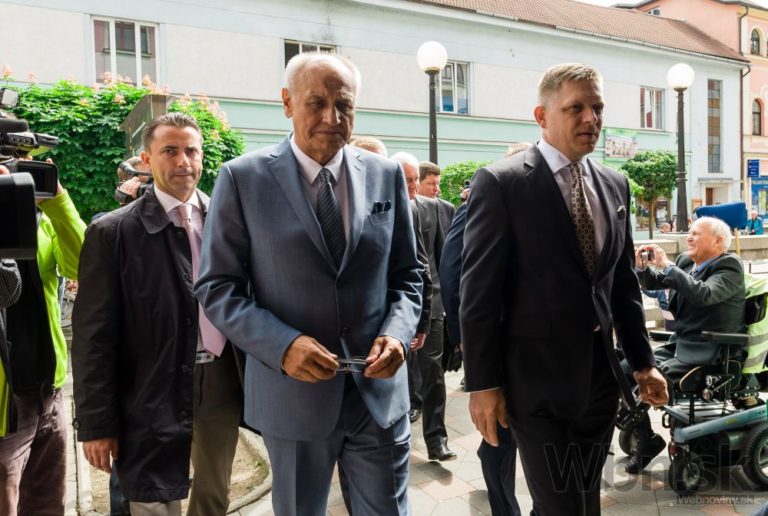 Sprava: Predseda vlády SR Robert Fico (v strede) a primátor mesta Ružomberok Igor Čombor počas príchodu na rokovanie 168. schôdze vlády SR v Ružomberku. Ružomberok, 24. jún 2015. Foto: SITA/Milo Fabian