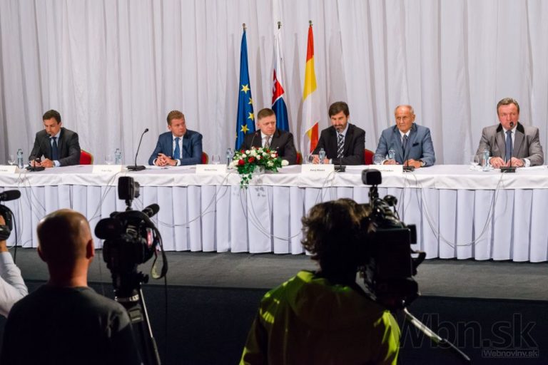 Zľava: Vedúci tlačového oddelenia Erik Tomáš, minister životného prostredia SR Peter Žiga, predseda vlády SR Robert Fico, predseda ŽSK Juraj Blanár, primátor mesta Ružomberok Igor Čambor a primátor mesta Liptovský Mikuláš Ján Blcháč počas tlačovej konferencie po rokovaní 168. schôdze vlády SR v Ružmberku. Ružomberok, 24. jún 2015. Foto: SITA/Milo Fabian