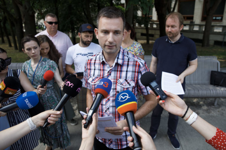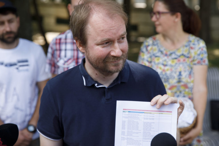 Člen správnej rady SKU Viktor Križo počas brífingu Slovenskej komory učiteľov (SKU) a odovzdávania vizitiek pedagogických a odborných zamestnancov, ktorí zo školstva odišli alebo odchádzajú. Na brífingu informoval o dôvodoch odchodu učiteľov zo školstva a predstavil návrh, ako situáciu zvrátiť. Bratislava, 30. jún 2022. Foto: archívne, SITA/Branislav Bibel