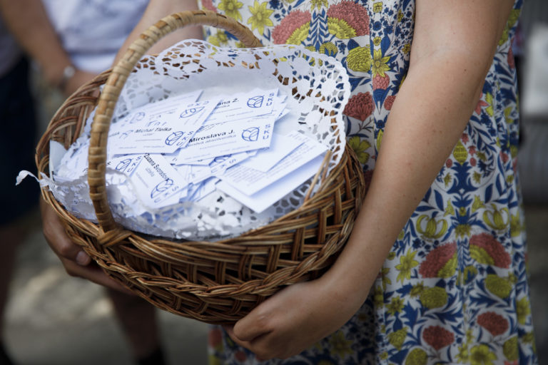 Vizitky odchádzajúcich učiteľov počas brífingu Slovenskej komory učiteľov (SKU) a odovzdávania vizitiek pedagogických a odborných zamestnancov, ktorí zo školstva odišli alebo odchádzajú. Na brífingu informovali o dôvodoch odchodu učiteľov zo školstva a predstavili návrh, ako situáciu zvrátiť. Bratislava, 30. jún 2022. Foto: SITA/Branislav Bibel