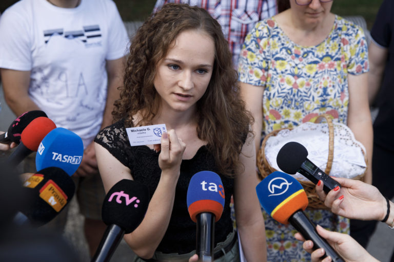 Odchádzajúca učiteľka Michaela G. počas brífingu Slovenskej komory učiteľov (SKU) a odovzdávania vizitiek pedagogických a odborných zamestnancov, ktorí zo školstva odišli alebo odchádzajú. Na brífingu informovala o dôvodoch odchodu učiteľov zo školstva a predstavila návrh, ako situáciu zvrátiť. Bratislava, 30. jún 2022. Foto: SITA/Branislav Bibel