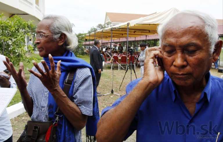 Bývalý služobník Červených Kmérov Chum Mey (vpravo) telefonuje krátko po vynesení verdiktu o doživotnom treste pre lídrov Kmérov. Foto: SITA/AP