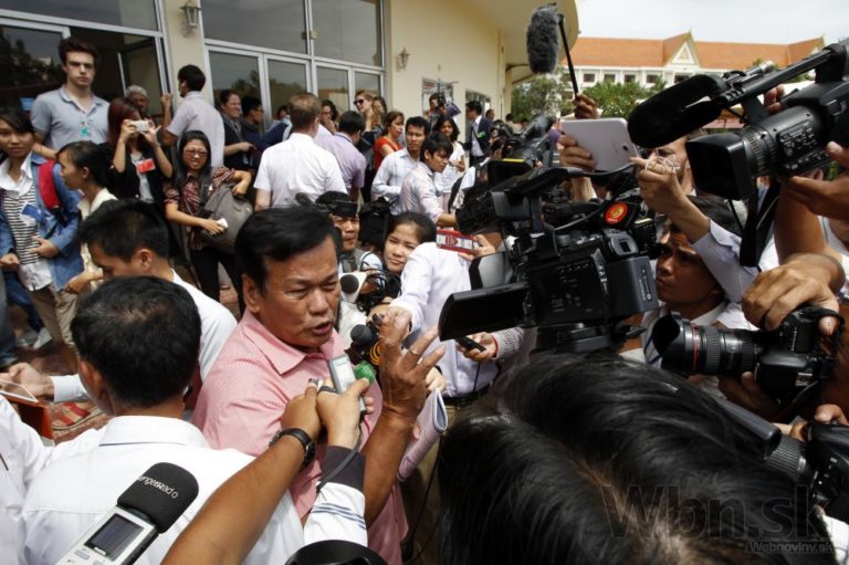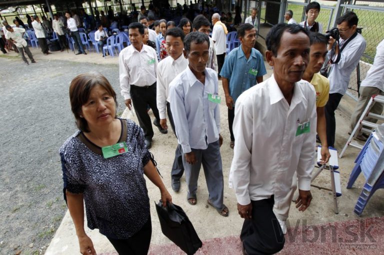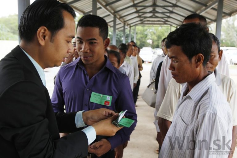 Súdny úradník Neth Pheaktra rozdáva Kambodžanom, ktorí si prišli vypočuť verdikt lístky. Foto: SITA/AP