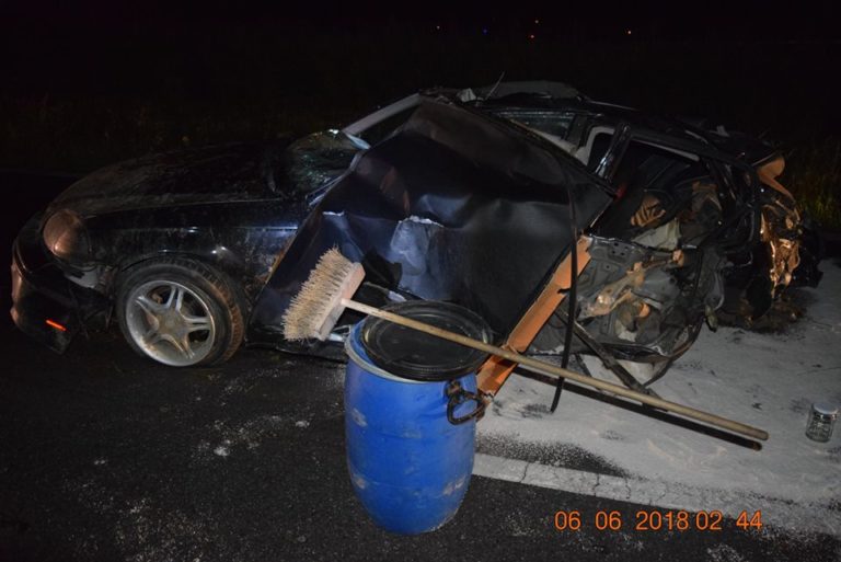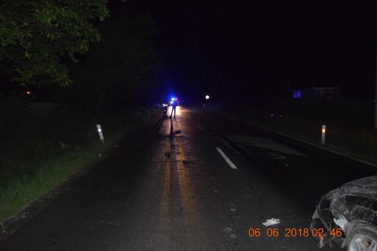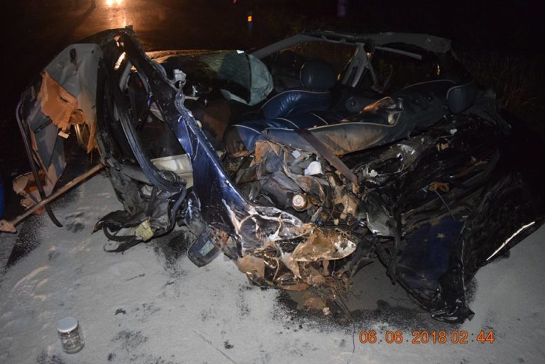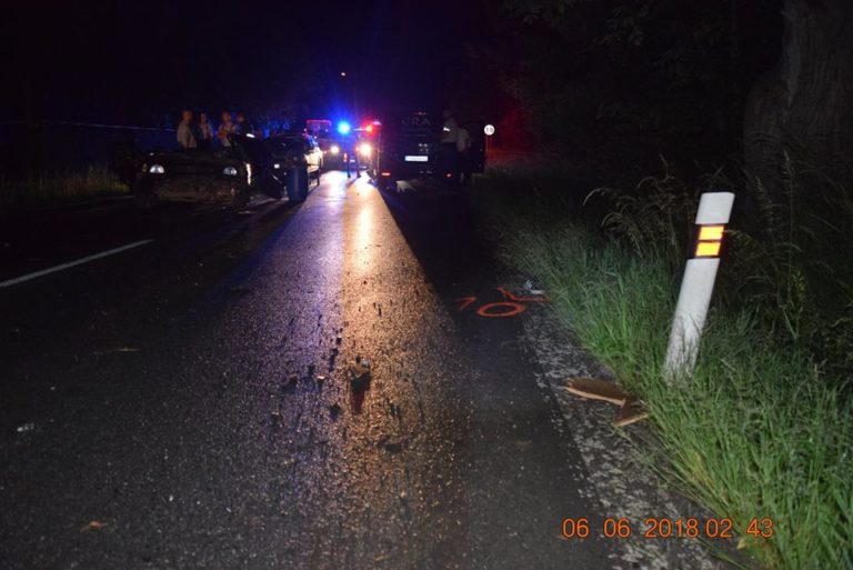 Honda Civic so štvorčlennou posádkou po prejazde dvojitej zákruty v blízkosti cintorína dostala šmyk, auto vyletelo z cesty, prevrátilo sa a vrazilo do stromu. V totálne zničenom aute prišli o život dvaja muži (25, 29), 20-ročný majiteľ auta a 26-ročný muž skončili s vážnymi zraneniami v nemocnici. Lipany, 6. jún 2018. Foto: www.facebook.com.