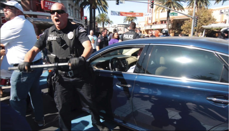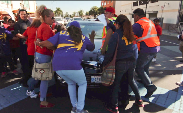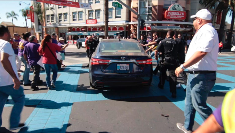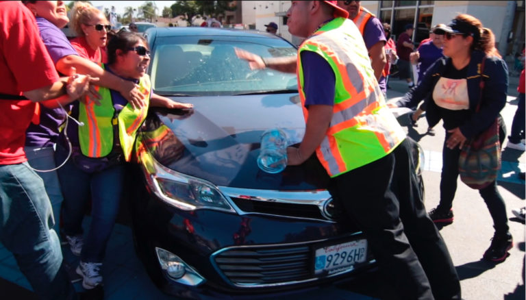 Vodič prešiel cez dav demonštrantov za práva migrantov. Video záznam incidentu ukazuje, ako sa vodič snažil prejsť cez zástup demonštrujúcich, ktorí boli na prechode pre chodcov. Jedného z nich tlačil autom pred sebou, ďalší mu vyskočil na kapotu a iní mlátili do auta, ktoré po chvíli zastavilo, pričom ho obklopili policajti. Brea, 26. október 2017. Foto: Antonio Mendoza/Unite Here Local 11 via AP.