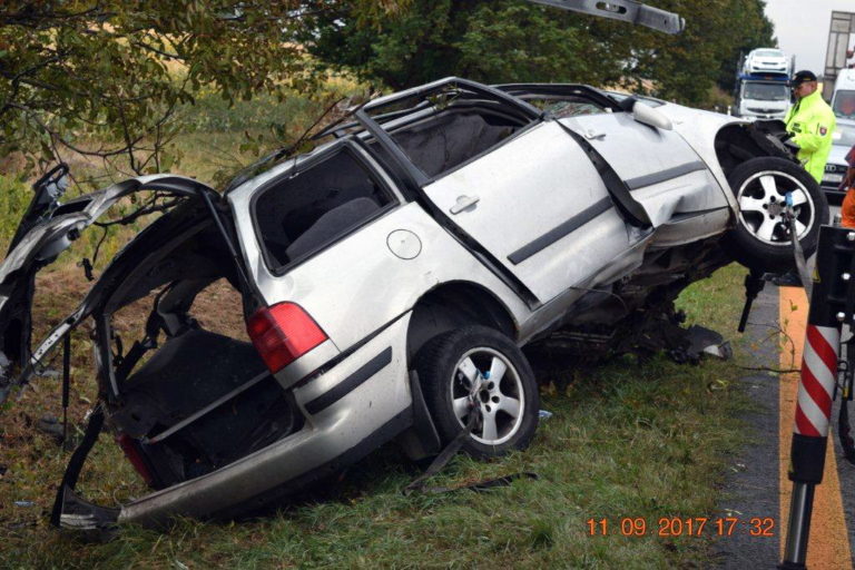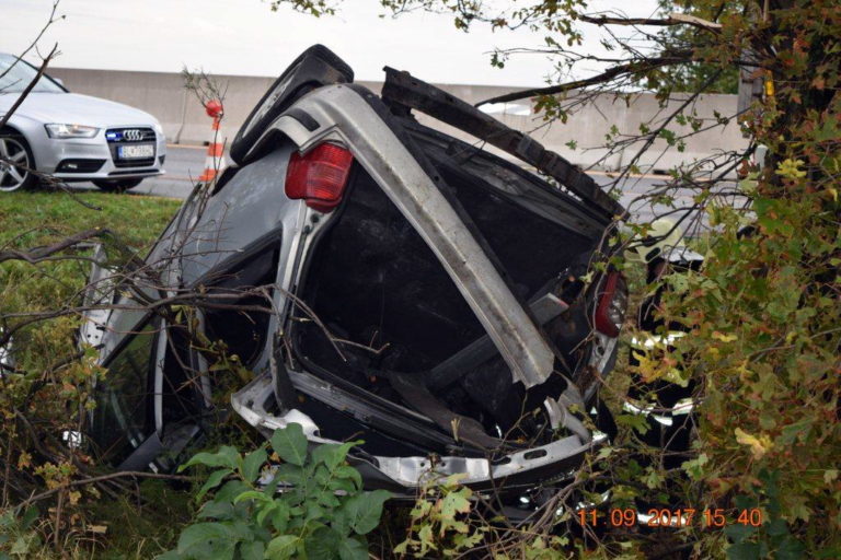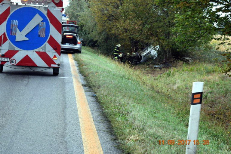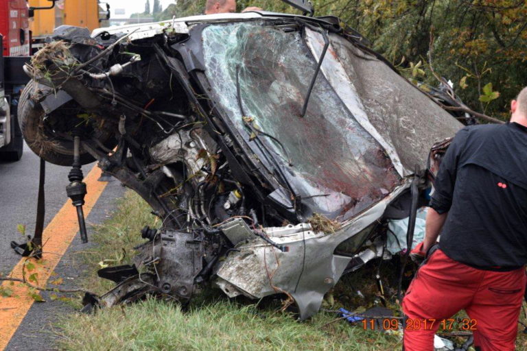 Včera prišlo k tragickej dopravnej nehode na diaľnici D1. K nehode došlo v smere na Bratislavu, kde 37-ročný vodič išiel autom Seat Alhambra v pravom jazdnom pruhu. Počas jazdy dostal pravdepodobne mikrospánok, prešiel na nespevnenú časť do rigola a vzápätí narazil do stromu. Nárazom došlo k prevráteniu auta a k zakliesneniu vodiča, ktorý vážnym zraneniam na mieste nehody podľahol. Bratislava, 12. september 2017. Foto: SITA/KR PZ Trnava