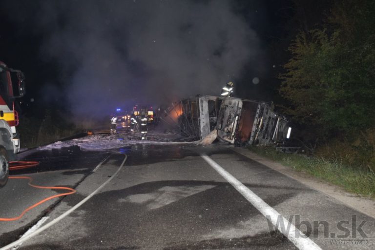 Tragická nehoda sa stala v nedeľu v noci na ceste I/50 v smere od Trenčína na Bánovce nad Bebravou. Čelná zrážka osobného auta s nákladiakom si vyžiadala život mladého vodiča, nákladné auto po nehode zhorelo. Bratislava, 3. august 2015. Foto: SITA/KR PZ Trenčín