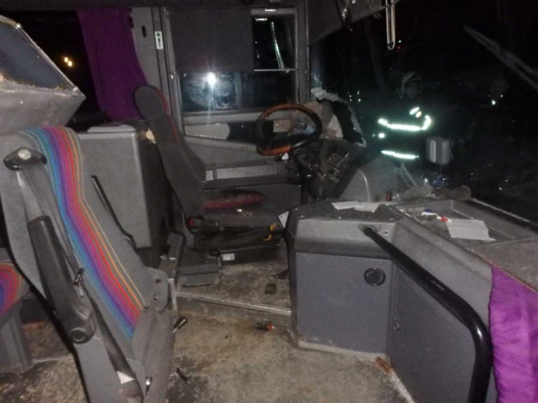 Dopravná nehoda, ktorá sa stala v utorok 27. decembra o 20:00 pri obci Topoľníky (okres Dunajská Streda). Neznámy vodič viedol biele nákladné auto smerom na obec Okoč, keď sa z neho uvoľnila časť návesu. Kovová tyč spolu s kusom plachty pri tom zasiahla 46-ročného vodiča autobusu, ktorý pre úraz zišiel mimo cestu. Vodič autobusu je ťažko zranený, ostatné osoby z autobusu sa pri nehode nezranili. Polícia hľadá vodiča nákladného auta. Foto: SITA/KR HaZZ Trnava