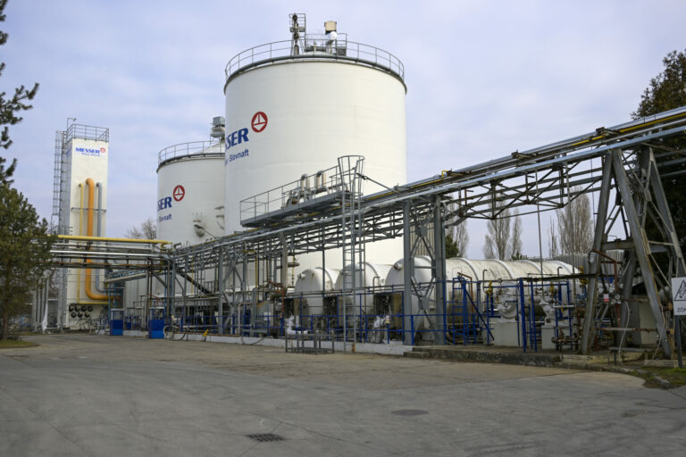 Pohľad na zásobníky kvapalného dusíka, ktoré slúžia ako záloha dusíkového generátora, vyrábajúceho dusík pre inertizáciu výroby počas tlačovej besedy spoločností Messer Tatragas a Slovnaft v priestoroch vodíkovej plniacej stanice v areáli Slovnaftu na tému: Bratislavská vodíková plnička mení ekologickú dopravu - dojazd vodíkových autobusov DPB sa zvýšil o 40 %, počet stojanov sa zdvojnásobil. Bratislava, 21. február 2025. Foto: SITA/Milan Illík