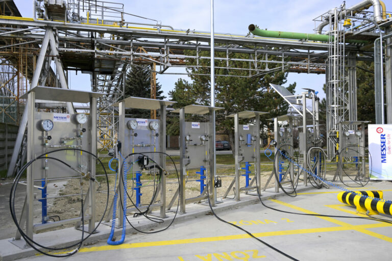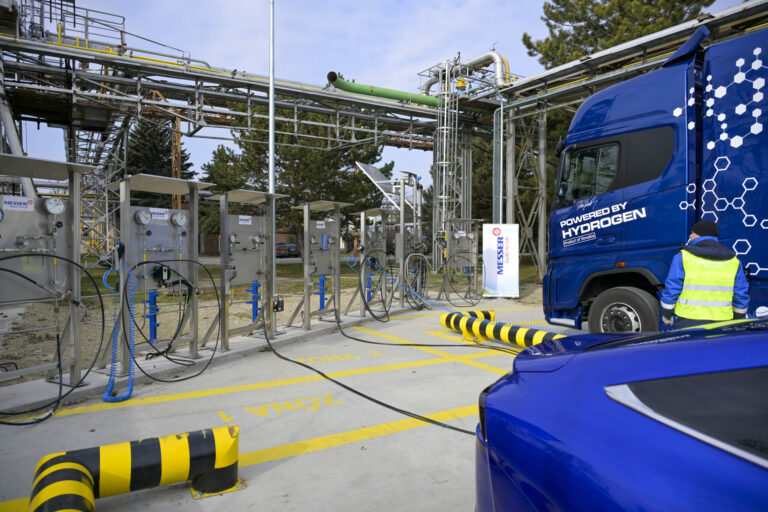 Vodíkové čerpacie stanice počas tlačovej besedy spoločností Messer Tatragas a Slovnaft v priestoroch vodíkovej plniacej stanice v areáli Slovnaftu na tému: Bratislavská vodíková plnička mení ekologickú dopravu - dojazd vodíkových autobusov DPB sa zvýšil o 40 %, počet stojanov sa zdvojnásobil. Bratislava, 21. február 2025. Foto: SITA/Milan Illík