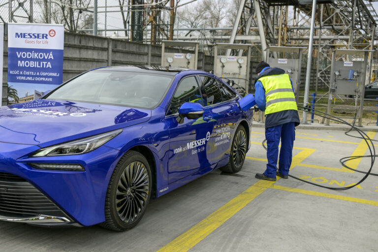 Obsluhujúci pracovník vodíkovej čerpacej stanice počas plnenia nádrže auta v rámci tlačovej besedy spoločností Messer Tatragas a Slovnaft v priestoroch vodíkovej plniacej stanice v areáli Slovnaftu na tému: Bratislavská vodíková plnička mení ekologickú dopravu - dojazd vodíkových autobusov DPB sa zvýšil o 40 %, počet stojanov sa zdvojnásobil. Bratislava, 21. február 2025. Foto: SITA/Milan Illík